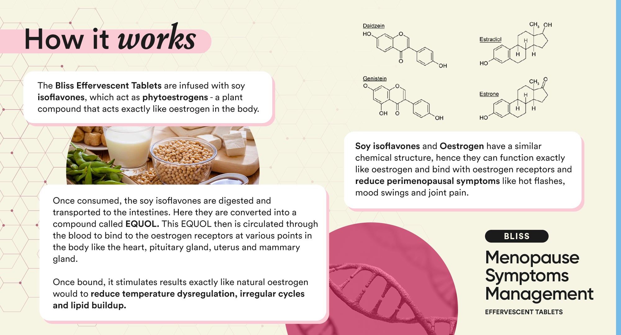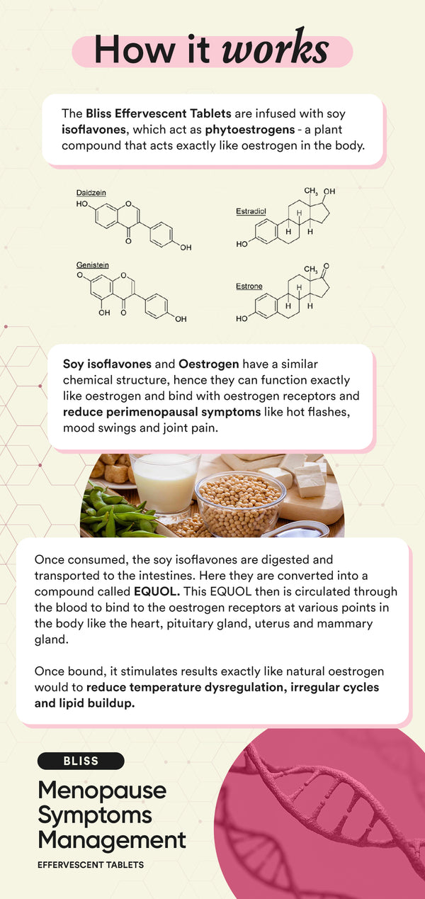 The Bliss Effervescent Tablets are infused with iso-flavones, which are plant-based oestrogen compounds. When women undergo perimenopause, their oestrogen levels drop, triggering a range of uncomfortable symptoms. The iso-flavones in this supplement mimic oestrogen function, significantly reducing hot flashes, night sweats, belly fat, water retention, and mood swings.