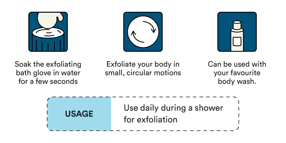 It is recommended to use a body exfoliating glove to remove dead skin cells 1-2 times a week if you have dry skin. If you have oily or combination skin, you can use the glove 3-4 times a week.
