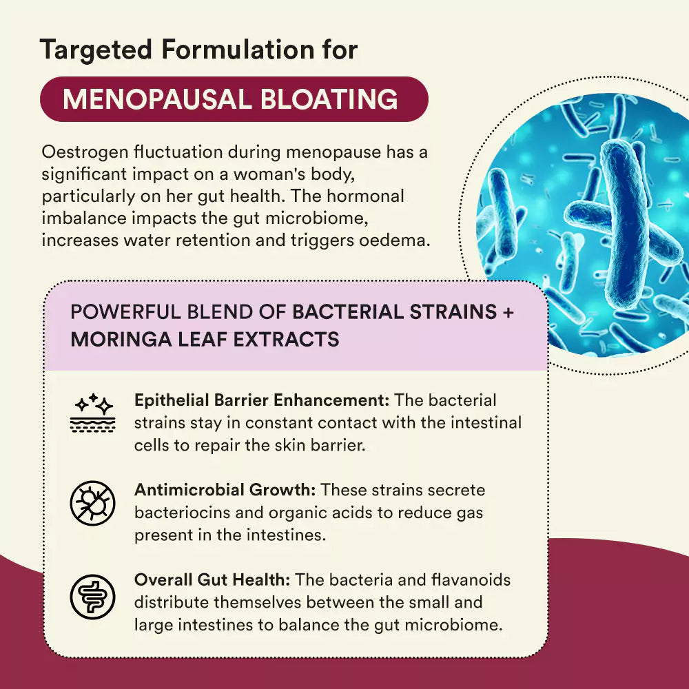 It is beneficial to have a probiotic supplement created for menopause to manage specific hormone-induced symptoms. Consuming probiotics helps with restoring the gut microbiome, reducing inflammation and eliminating gas.