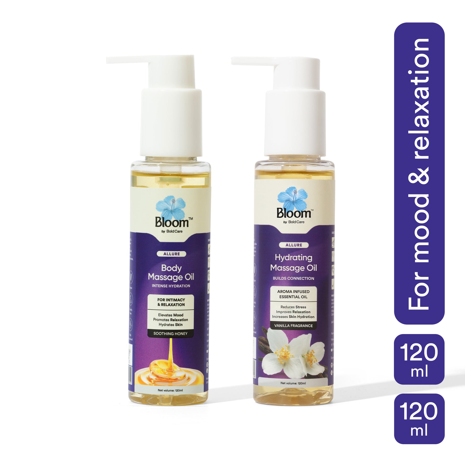 The Intimate Glow is a curated combo of two all-natural body massage oils that promote intimacy and relaxation, for couples and individual users. - Allure Body Massage Oil for intense skin hydration, muscle relief and intimate arousal. - Allure Sensual Massage Oil for relaxation, muscle stiffness and deeper connections.