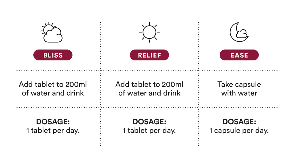 This is a comprehensive pack of nutrients to manage menopausal symptoms in women after the age of 40. The products target the root cause concern - hormonal imbalance - with the Bliss Complete Menopause Support Effervescent Tablets - as well as correlated symptoms like night sweats and bloating with the Ease Softgel Capsules and Relief Effervescent Tablets.