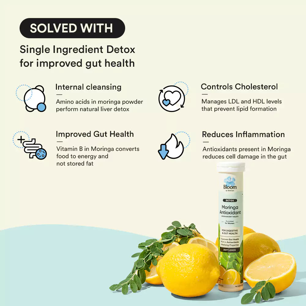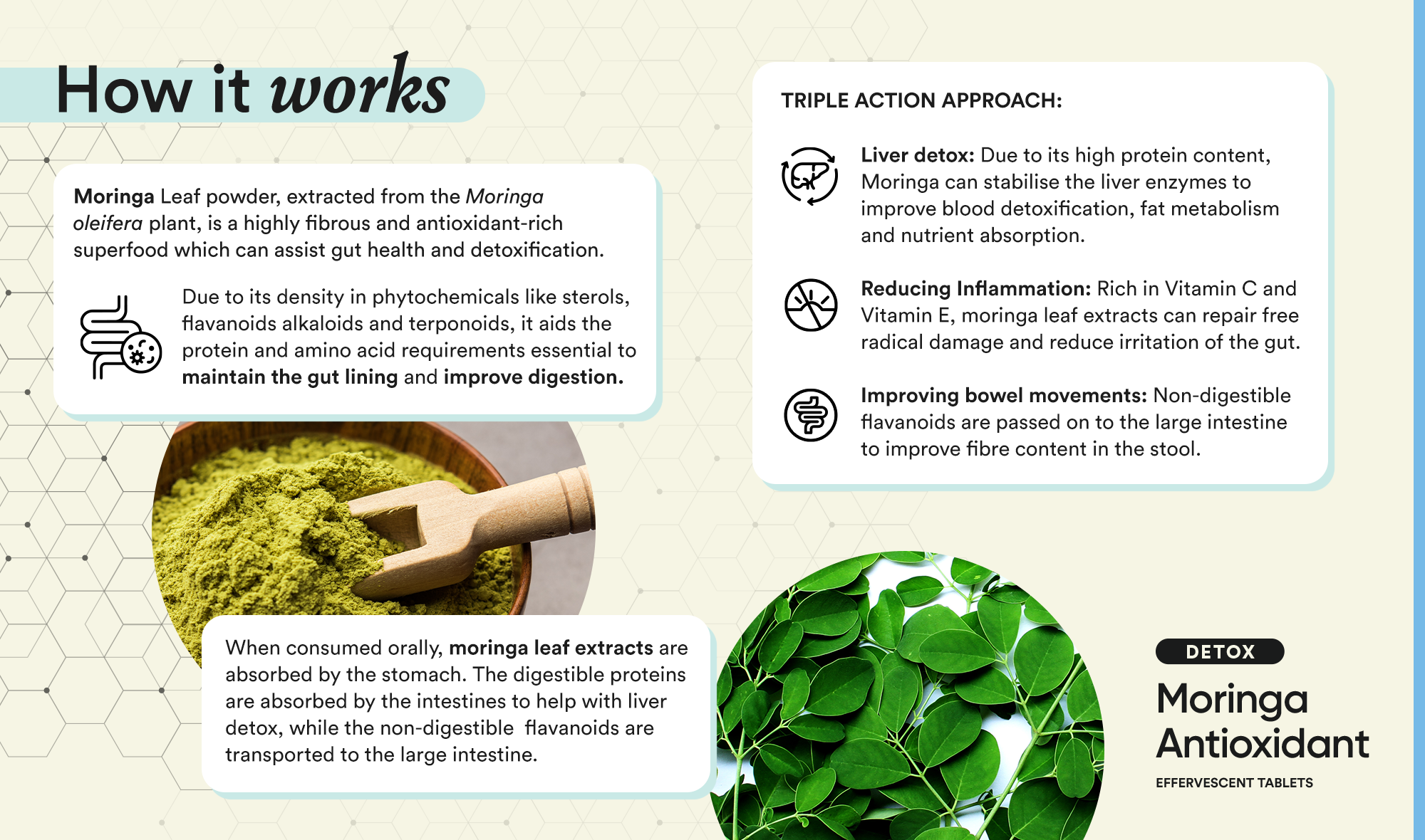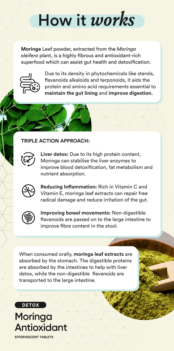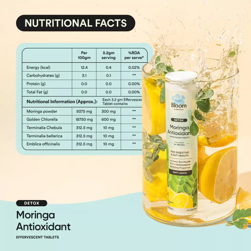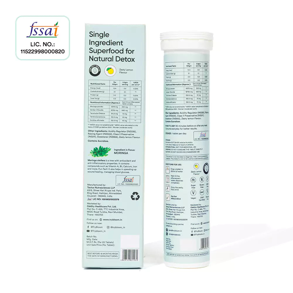 The Detox Moringa Effervescent Tablet is formulated with a combination of natural moringa leaf powder and emblica officinalis for better gut health, well-being, and overall health benefits.