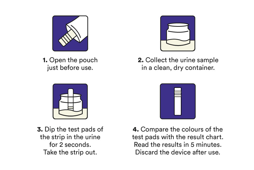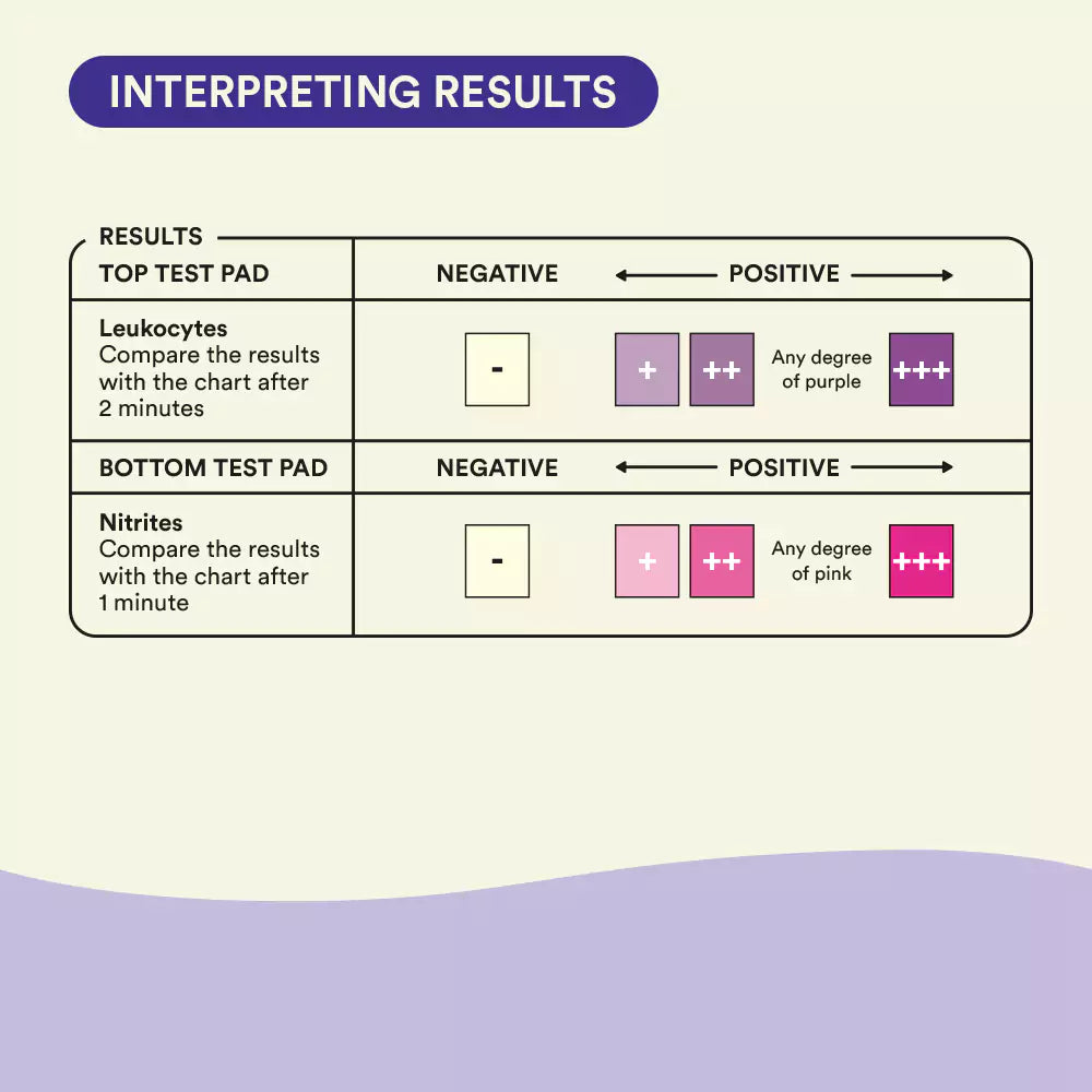 You can use the Secure UTI Instant Detection kit by placing the testing strips in your urine for 2 seconds. Then compare the result against the colour chart provided.